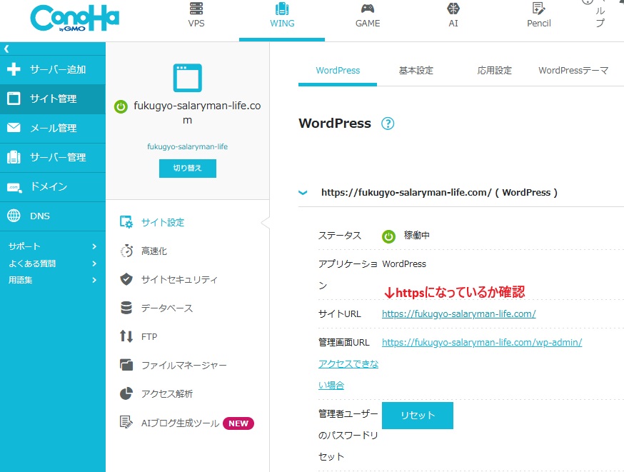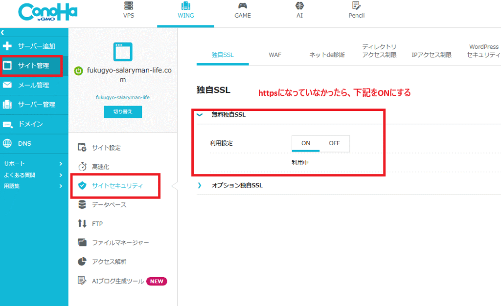 - ConoHa WING → サイト管理 → サイト設定 → 独自SSL