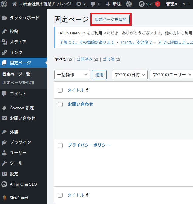 ここではプライバシーポリシー/お問い合わせ/運営者情報(プロフィール)の3つを用意します。