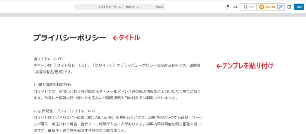 本ページは「[サイト名]」(以下、「当サイト」)のプライバシーポリシーを定めるものです。運営者は[運営者名/屋号]です。
