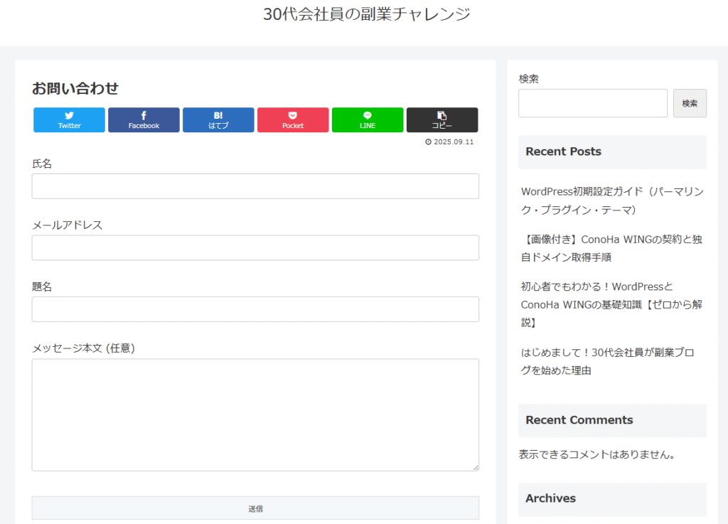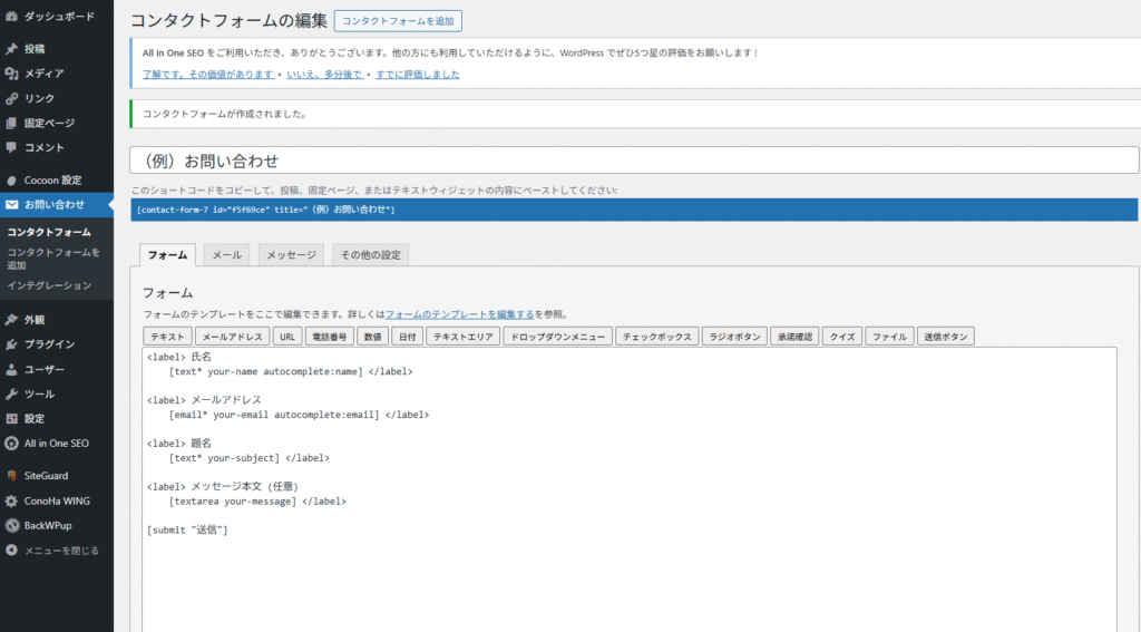 - お問い合わせ → 新規追加(プラグイン:Contact Form 7)
