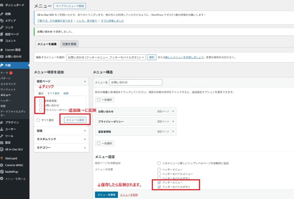 それぞれ 固定ページ → 新規追加 で作成し、公開 → フッターにメニュー表示まで行います。