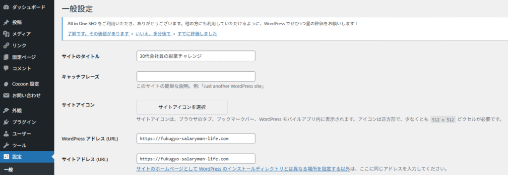 - WordPress アドレス (URL) と サイトアドレス (URL) を